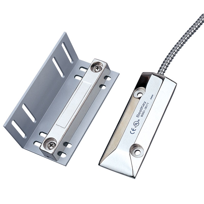 Contacto Magnético para cortinas metálicas. Montaje para piso, incluye soporte de montaje para la cortina. Imán con terminación en plástico. Tipo de contacto NC.