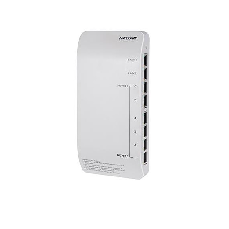 Switch distribuidor de audio y video para videoporteros. cuenta con 8 interfaces rj-45, incluyendo seis 10/100 mbps lan interfaces que suministran alimentación poe (24v) para pantallas, y dos 10/100 mbps para conexión de switches en cascada (hasta 8 distribuidores se pueden cascadear). alimentación 24vdc 3a (fuente no incluida). compatibilidad: pantallas ds-kh6210-l y frentes de primera generación (ds-kv8x02). no apto para pantallas kh6320 ni sistema modular.